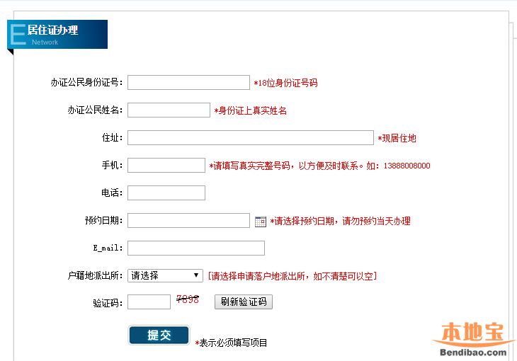 所需填寫的信息包含:辦證公民身份證號、辦證公民姓名、住址、手機(jī)、電話、預(yù)約日期、E_mail、戶籍地派出所、驗證碼;