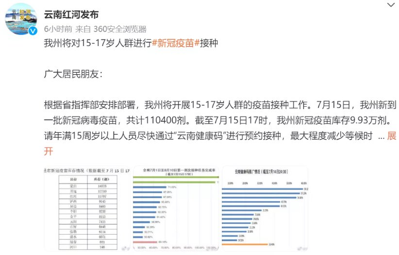 根據(jù)省指揮部安排部署,紅河州將開展15-17歲人群的疫苗接種工作。7月15日,紅河州新到一批新冠病毒疫苗,共計110400劑。截至7月15日17時,紅河州新冠疫苗庫存9.93萬劑。