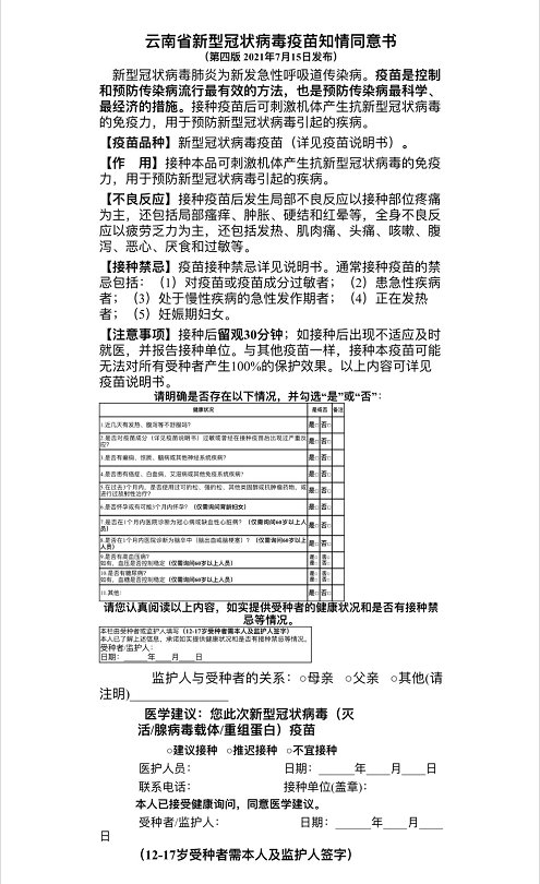 此次接種的人群屬未成年,需家長(zhǎng)(監(jiān)護(hù)人)簽訂《云南省新型冠狀病毒疫苗知情同意書(shū)》。所以,各位家長(zhǎng)一定要認(rèn)真閱讀并根據(jù)孩子實(shí)際情況簽字。目前,該份同意書(shū)已經(jīng)轉(zhuǎn)發(fā)到全市各校班級(jí)群,家長(zhǎng)可聯(lián)系孩子所在班級(jí)的班主任進(jìn)行咨詢。