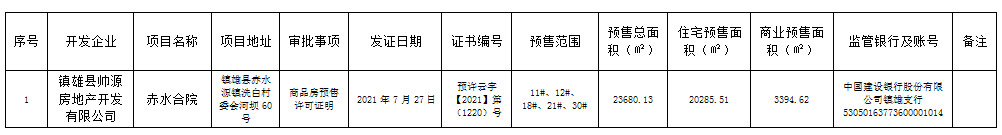 根據(jù)《中華人民共和國城市房地產(chǎn)管理法》、《城市商品房預(yù)售管理辦法》、《住建部房屋交易與產(chǎn)權(quán)管理工作導(dǎo)則》、《云南省城市房地產(chǎn)開發(fā)交易管理條例》、《昭通市人民政府關(guān)于調(diào)整第二批行政職權(quán)事項的決定》(昭政發(fā)〔2019〕20號)等相關(guān)法律法規(guī)規(guī)定,現(xiàn)將鎮(zhèn)雄縣住房和城鄉(xiāng)建設(shè)局2021年7月27日受理并辦理鎮(zhèn)雄縣帥源房地產(chǎn)開發(fā)有限公司赤水合院項目《商品房預(yù)售許可證明》情況予以通告如下: