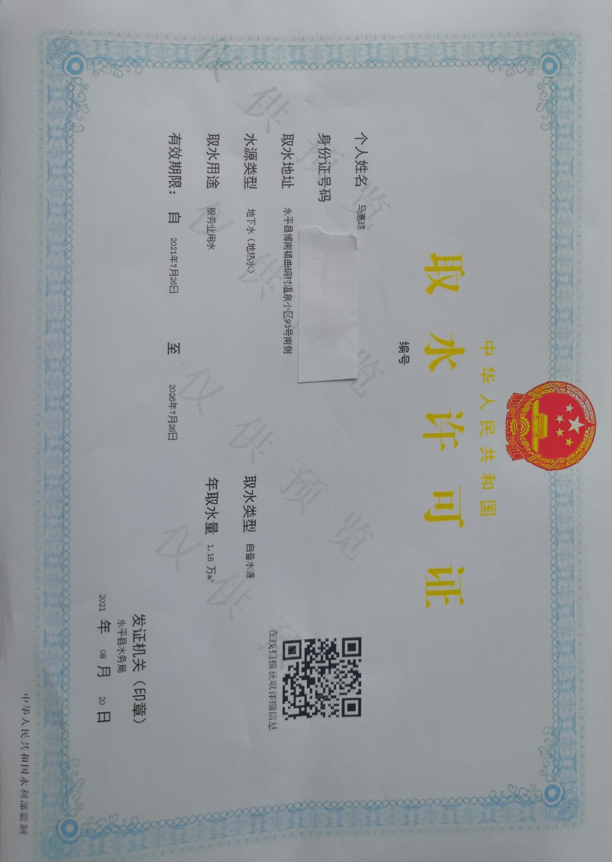 一、同意給予永平惠瓊百貨經(jīng)營部溫泉取水工程核發(fā)取水許可證。取水地點(diǎn)、取水量、退水地點(diǎn)、退水量、取水用途及最小生態(tài)下泄流量等嚴(yán)格按照《永平縣水務(wù)局關(guān)于準(zhǔn)予永平惠瓊百貨經(jīng)營部溫泉取水工程取水許可申請的行政許可決定書》(永水許〔2021〕20號(hào))執(zhí)行。