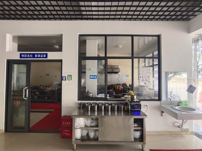 2.在就餐區(qū)醒目位置公示證照,就餐場(chǎng)所布局合理、干凈整潔,規(guī)范設(shè)置洗手設(shè)施,采取“透明廚房”式明廚亮灶,各類標(biāo)識(shí)明顯。