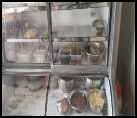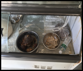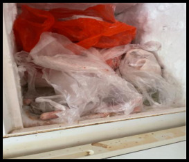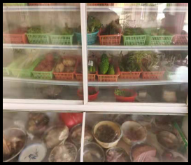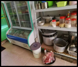 4、儲藏區(qū)物品雜亂,柜內(nèi)肉食裸露存放,衛(wèi)生條件差。