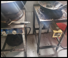 4、后廚環(huán)境差,物品擺放雜亂,灶臺、墻面油污重。
