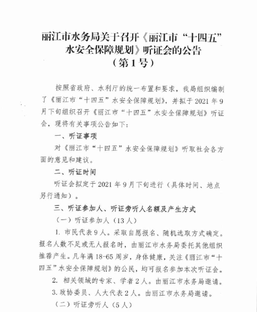 麗江市水務(wù)局關(guān)于召開《麗江市“十四五”水安全保障規(guī)劃》聽證會公告