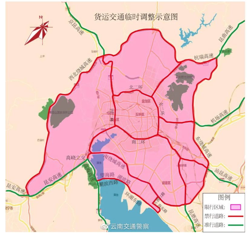 劇毒化學(xué)品運輸車輛、核定載質(zhì)量1000千克(含)以上載貨汽車以及牽引車、掛車、吊車等專項作業(yè)車(不含執(zhí)行緊急任務(wù)的特種車輛)全天禁止在東繞城高速(含)-昆曲高速(含)-西北繞城高速(含)-昆安高速(不含)-高海高速(不含)-湖濱西路(含)-望海路(含)-湖濱西路(含)-湖濱東路(含)-環(huán)湖東路(含)-古渡口路(含)-南繞城高速(含)圍合區(qū)域內(nèi)道路通行。