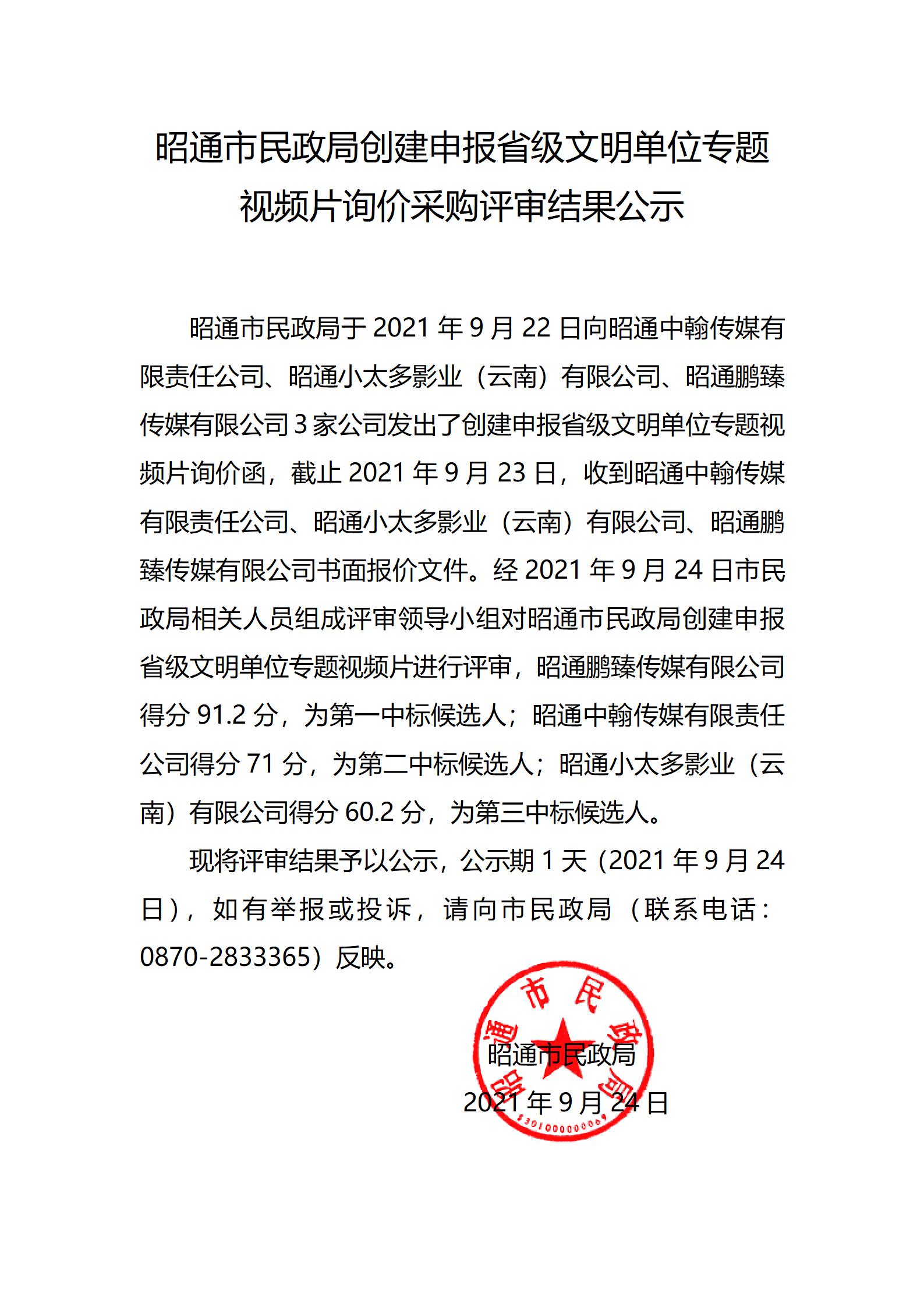 昭通市民政局創(chuàng)建申報省級文明單位專題視頻片詢價采購評審結(jié)果公告