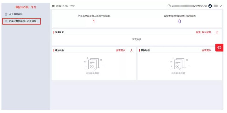 成功登錄系統(tǒng)后,首頁左側(cè)為功能菜單導(dǎo)航區(qū)。包括【企業(yè)概要】【汽車及摩托車出口許可申報(bào)】,右側(cè)工作區(qū)上方會(huì)顯示企業(yè)當(dāng)前的業(yè)務(wù)數(shù),通過點(diǎn)擊數(shù)字可快速進(jìn)入相應(yīng)應(yīng)用。