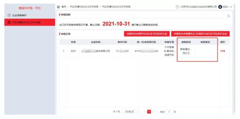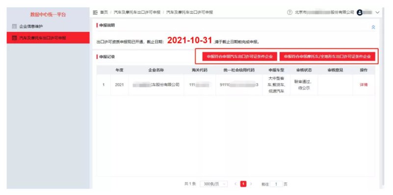 通過點(diǎn)擊功能菜單【汽車及摩托車出口許可申報(bào)】進(jìn)入出口許可申報(bào)列表頁面。列表展示已經(jīng)申報(bào)的記錄及審批狀態(tài)。
