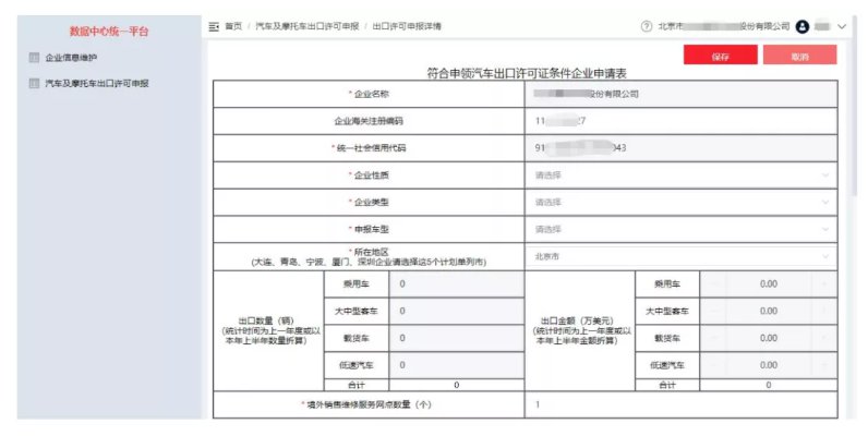 通過點(diǎn)擊按鈕【申報(bào)符合申領(lǐng)汽車出口許可證條件企業(yè)】或【申報(bào)符合申領(lǐng)摩托車/全地形車出口許可證條件企業(yè)】可進(jìn)入相應(yīng)的申報(bào)頁面。