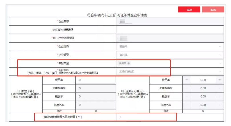 選擇【申報(bào)車型】后,相應(yīng)的車型出口數(shù)量和出口金額方能編輯,其中申報(bào)車型可多選。注意選擇【所在地區(qū)】【境外銷售維修服務(wù)網(wǎng)點(diǎn)數(shù)量(個(gè))】。