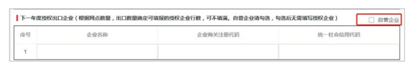 授權(quán)出口企業(yè)表格會(huì)根據(jù)企業(yè)維護(hù)的境外銷售維修服務(wù)網(wǎng)點(diǎn)數(shù)量、出口數(shù)量信息自動(dòng)確定表格行數(shù),不能增減,企業(yè)可不填滿,但如果非自營(yíng)企業(yè)至少需填寫1行。自營(yíng)企業(yè)請(qǐng)勾選自營(yíng)企業(yè)標(biāo)識(shí),勾選后無需填寫授權(quán)出口企業(yè)。