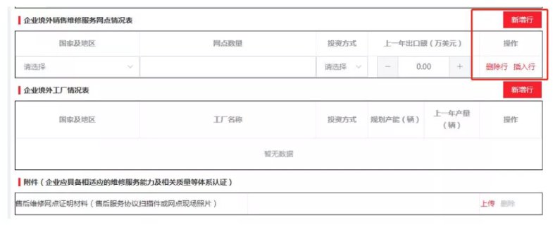 企業(yè)根據(jù)自身情況,填寫企業(yè)境外銷售維修服務(wù)網(wǎng)點(diǎn)情況表、企業(yè)境外工廠情況表,可進(jìn)行新增行、刪除行。其中境外銷售維修服務(wù)網(wǎng)點(diǎn)合計(jì)數(shù)需與前面填寫的境外銷售維修服務(wù)網(wǎng)點(diǎn)數(shù)量(個(gè))保持一致。