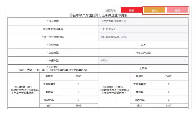 確認(rèn)填報(bào)信息無誤后,點(diǎn)擊界面中的【提交】按鈕,商務(wù)主管部門即可收到相應(yīng)的申報(bào)信息,在商務(wù)主管部門尚未審批前可通過點(diǎn)擊【撤回】按鈕撤回申報(bào),撤回的申報(bào)可再次編輯,提交。