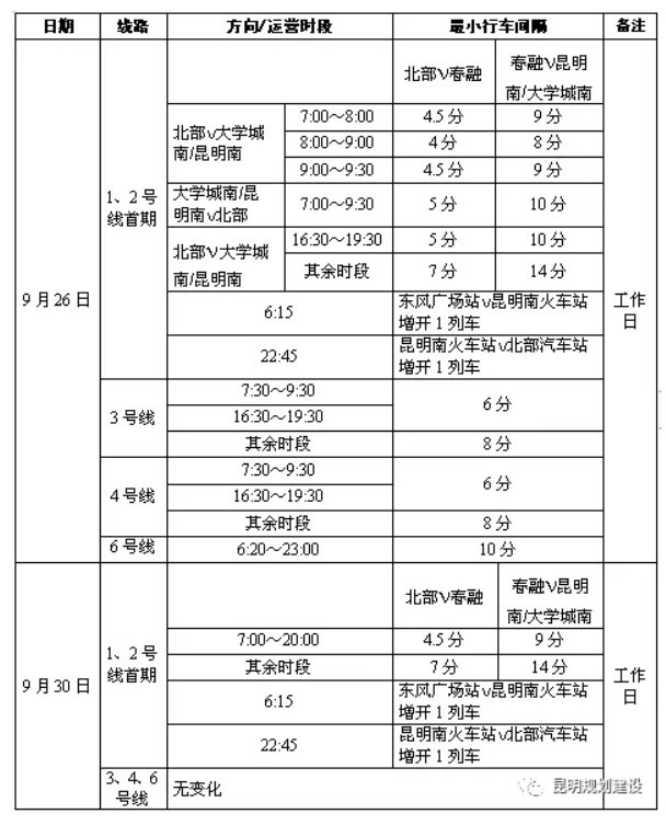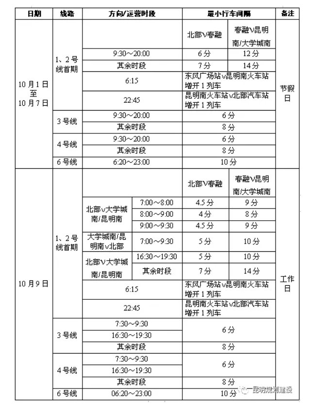 2021昆明地鐵十一假日運行圖