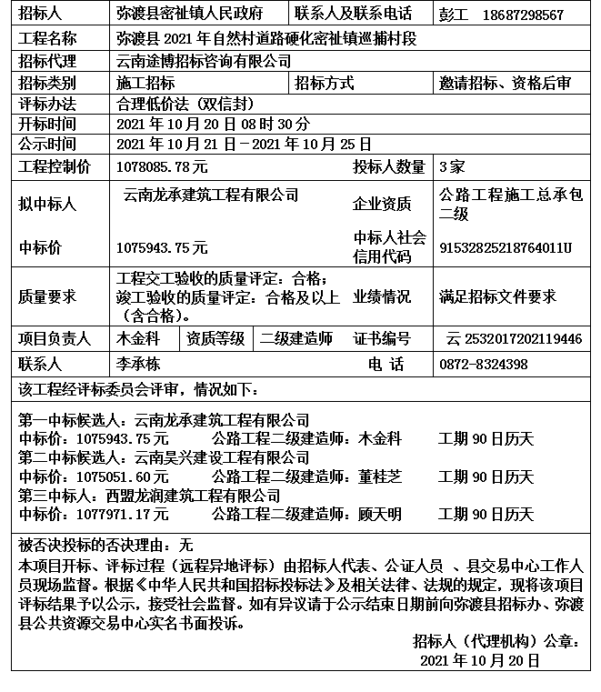 大理市彌渡縣2021年自然村道路硬化密祉鎮(zhèn)巡捕村段中標候選人公示