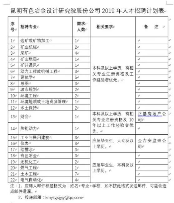 昆明有色冶金設計研究院股份公司2019年招聘計劃表