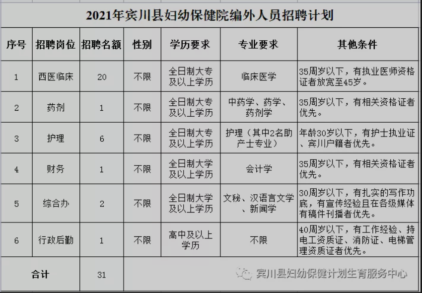 賓川縣婦幼保健院2021年面向社會公開招聘編外人員公告
