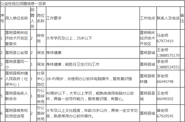 招聘具體事宜請(qǐng)咨詢用人單位。符合公益性崗位上崗條件的個(gè)人也可以到嵩明縣勞動(dòng)就業(yè)服務(wù)局綜合科申請(qǐng)公益性崗位求職登記,詳詢陳老師:0871-67917444。