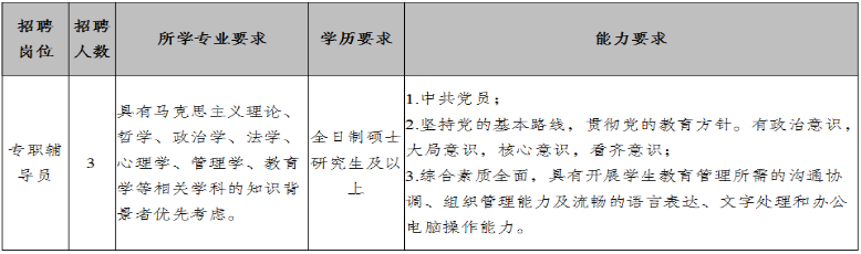 為適應學校發(fā)展的需要,需面向社會誠聘3名專職輔導員,現(xiàn)將有關(guān)事項公告如下: